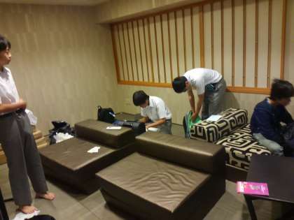 いよいよ修学旅行最終日となりました。健康チェック表によると睡眠時間0の生徒もいるとか。身支度や部屋の整理整頓が早いところもあれば、眠そうな目をこすりながら準備する部屋もありました。天気は曇りで、これから朝食です。