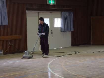 3月27日(月)より、本校創立50周年の記念事業として体育館床の再塗装工事が始まりました。本日は、これまでの塗装面を削る作業でした。春休み中の生徒の体育館での部活動に不自由をかけていますが、再塗装により、滑りやすかった床や見えにくかったコートのラインが改善され、思い切ったプレーができることと思います。生徒には4月1日(土)から使用させる予定です。ご理解とご協力をお願いいたします。