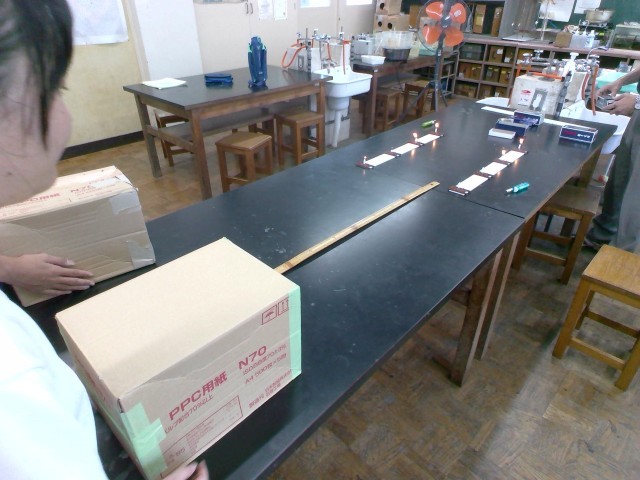 最近は、生徒1人1人が段ボールで空気砲を作成し、4本のろうそくの火が1回の空気砲でどのくらい消えるか記録しています。