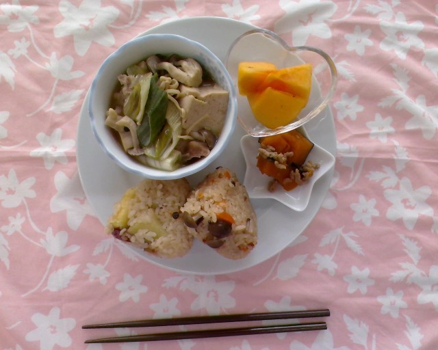 おかずには好みのきのこや野菜を加えて、自分好みの味を追求しました。先生の作った「かぼちゃのそぼろ煮」と秋の味覚「柿」を添えて秋らしいランチの完成です!