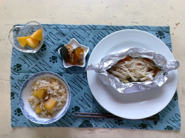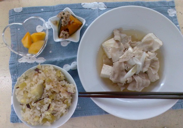 「鮭のホイル焼き」「肉豆腐」「さつまいもご飯」「きのこの炊き込みご飯」からおかずとご飯をそれぞれ1品ずつ選んで調理しました。