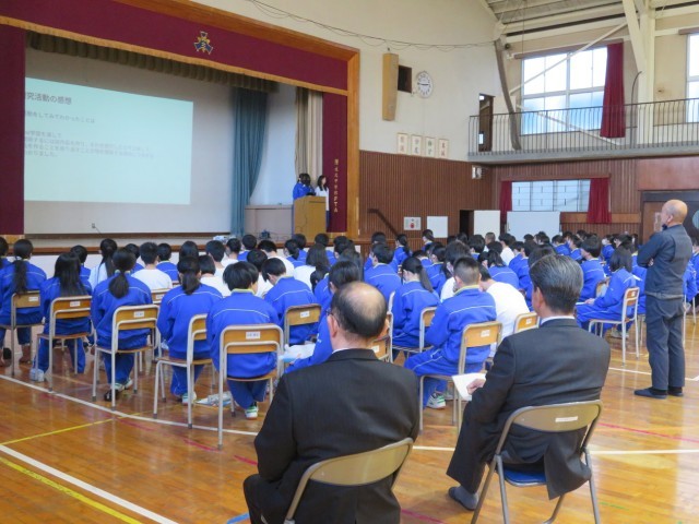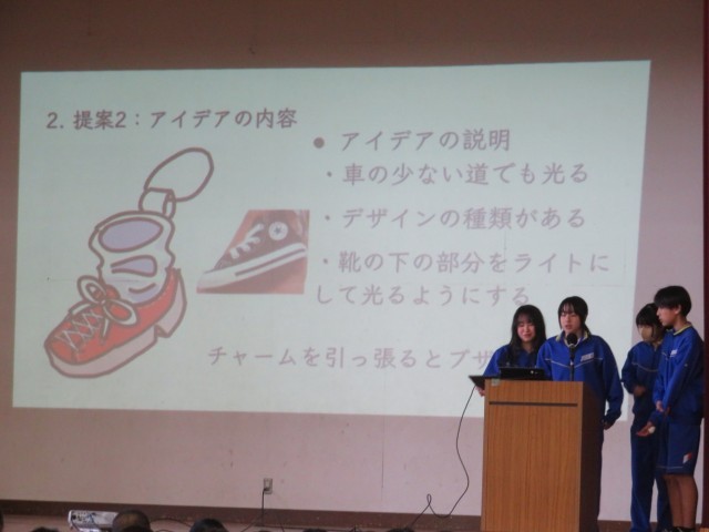 2月3日(火)、1年小田原版STEAM学習、本探究10日目として、各クラスの代表班が、これまで取り組んできた課題とプロトタイプについて、地域の協力者である宮内さんに向けて発表しました。