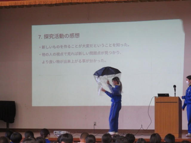 発表内容 「街頭につける防犯ブザー」  「カッパ自転車ライト」  「てるてる傘」  「お守り防犯ブザー」