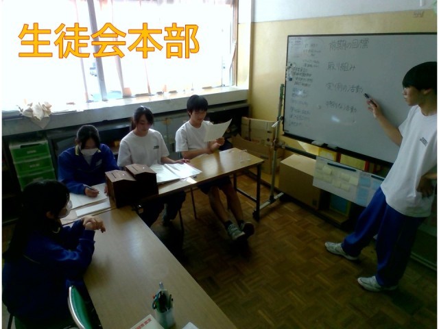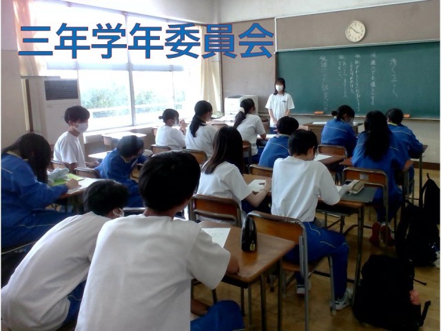 放課後、今年度最初の委員会活動が行われました。生徒会本部や三年学年委員会の生徒たちは、「明るい学校をつくること」を目指し、「すすんで考えること」を実践しようとする姿が見られました。