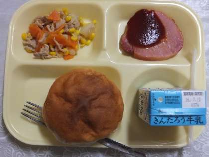 献立はグリルハムバーガー(コッペパン)、野菜ソテー、牛乳です。
