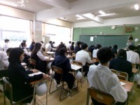 3校時、2年生は技術科で栽培の授業に取り組んでいました。指導者の説明を一人ひとりが真剣に聞き入り、その後各自が苗を植える作業になりました。土や水に触れる作業は人間の原点といえます。夏にはそれぞれのトマトが実をつけることでしょう。おいしくする一番の秘訣は…「おもいやり」でしょうか。