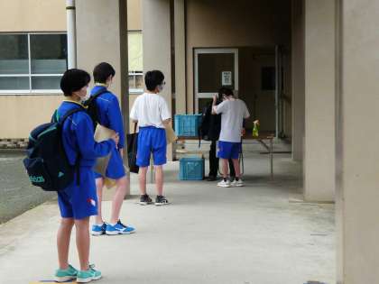 お昼前に雨が上がり、蒸し暑さが出てきました。登校する生徒たちは「おはようございます」「さようなら」等々きちんとあいさつを返してくれます。また準備された青いラインに並ぶ真面目な心の持ち主ばかりでした。これからも地道なことを大切に努力を継続してください。