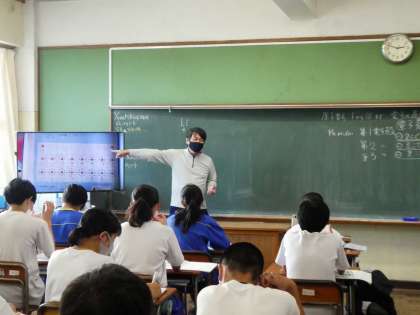 6校時、3年生理科では原子について勉強していました。難しい分野ですが、原子をメリーゴーランドに例えたり、指導教諭の味のある授業展開で生徒たちの目は輝いていました。「むづかしいことをやさしく、やさしいことを深く 深いことをおもしろく…」そんな雰囲気が教室に漂っていました…。