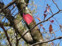 体育館横の城南の森に落葉が重なっています。その中の一枚に、そろそろ土に帰ろうとしている赤紫色の穴の空いた葉が目に留まりました。緑の葉たちが優しく見守っているように映りました。人間社会もこうありたいもの...