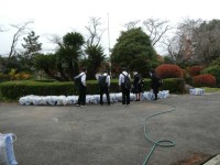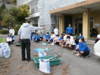 技術科の授業の準備、体育館山側の整備のための砂利、几帳面な仕事が学校作りの土台となっています。地に落ちた葉に最後の情熱を感じます。一日のスタートです。