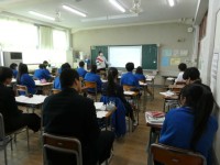 エプロン制作は名前の刺しゅうを入れる段階にきているようです。教諭は生徒一人ひとりに丁寧な助言をおくります。「針と糸で自分の手で作る」とれも貴重な経験の場となっています。