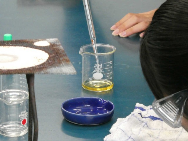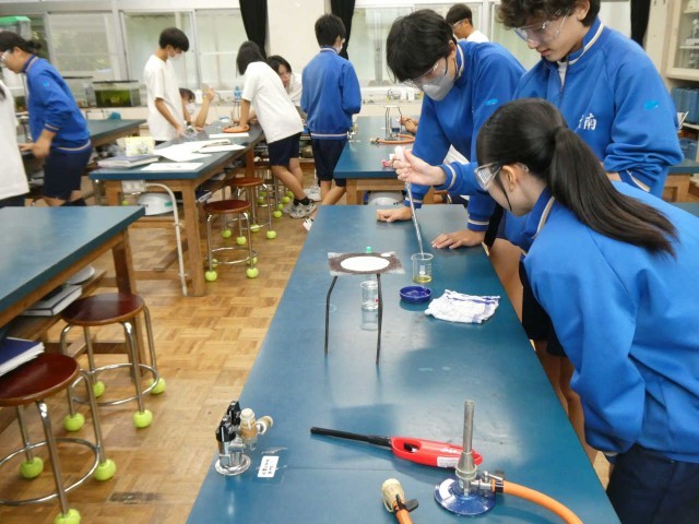 酸性、アルカリ性の水溶液がテーマです。指導教諭の指示を守り、実験が進んでいきます。予想通りにいかないところが実験の醍醐味でしょうか。授業は「理屈と現実は違う」ことを学ぶ場でもあります。生徒たちの真面目な授業態度が光りました。