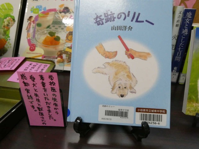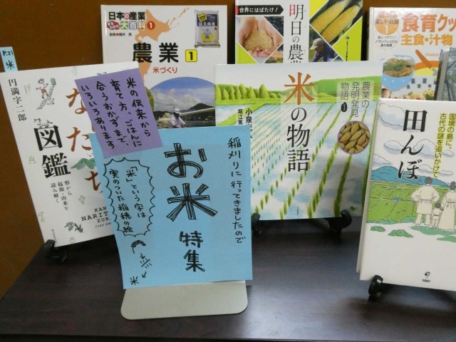 学校司書さんが職員室前廊下に季節の本を新調してくれました。今回は学校医さんが書かれた絵本「奇跡のリレー」も仲間に入っています。お米特集もあり、そこを通るだけで、気持ちが明るくなるような展示コーナーとなっています。