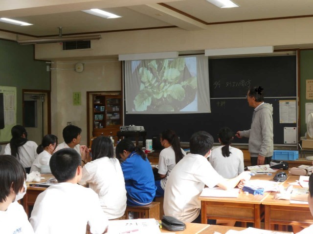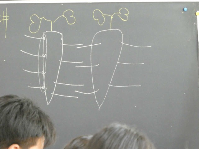 「ダイコンの育て方」がテーマです。「子葉がハート型のものが形の良いダイコンになる」「子葉の生えている方向に側根が伸びる(これは大人でも知らない人が多い)」ダイコンについての豆知識が次々に紹介され、授業に参加しているだけでダイコン博士になれそうです。きっとこの授業を外のダイコンたちも聞いていることでしょう。