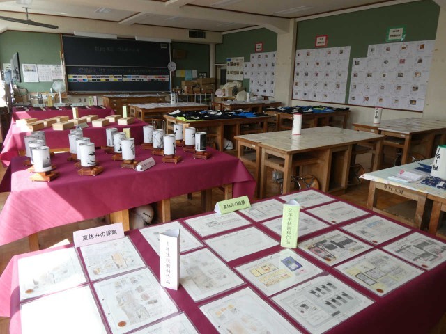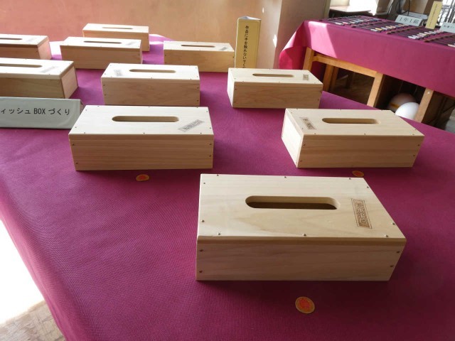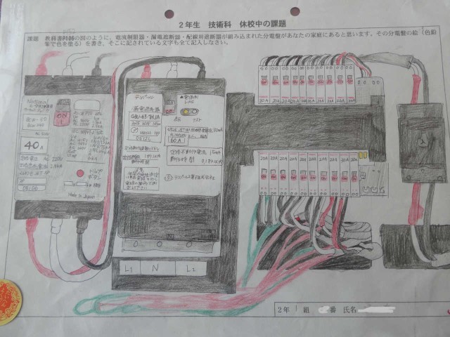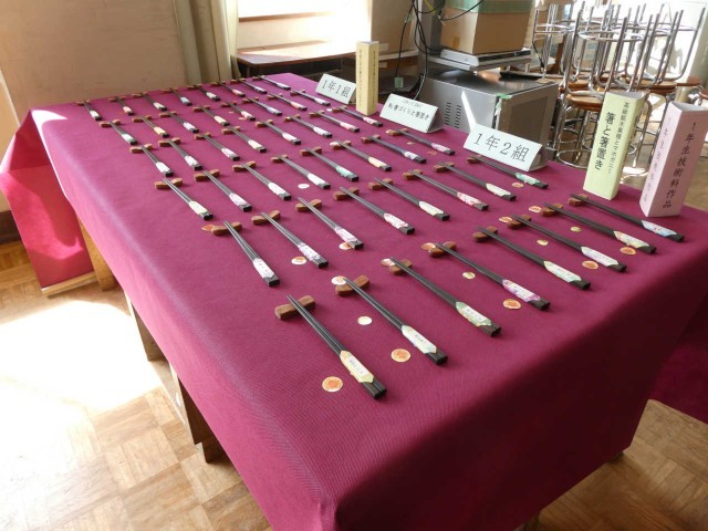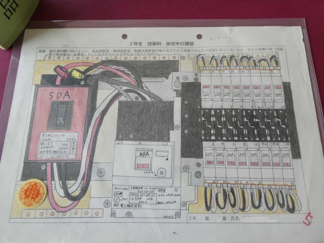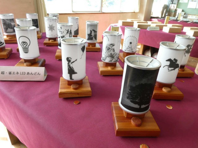 技術家庭科の展示会場の風景です。分電盤の精密な図は夏休みの宿題、きれいに模様のついたLED行灯、名前が刻印された木製テッシュボックス、丁寧に研磨されたお箸、紫色の布地が作品の一つひとつを一層輝かせています。一見の価値あり!です。
