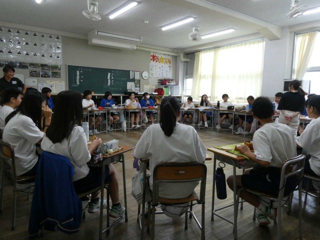 今日は「食育の日」でお弁当持参となっています。家庭科と連動していて「自分で作るお弁当」が教室で個性豊かに、おいしそうに輝いていました。中には大盛弁当もあり、中学生らしさが随所に表現されています。