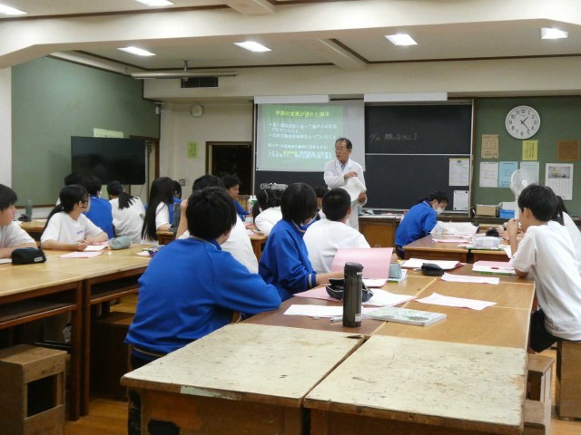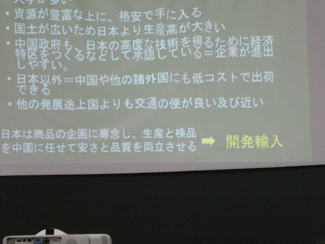 「情報の取り出し」がテーマです。我々の身の周りには「made in China」の製品で溢れています。その理由が教諭と生徒との対話により次々にあげられました。経済特区(税制優遇),開発輸入、ユニクロ…具体的で記憶に留まりやすい授業形態で、生徒たちは考えたことを素直に表現していました。