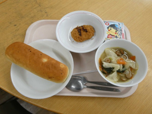 担任の先生と一緒に仲良く準備をする3年生の教室風景です。本日の献立は「チーズパン、豚肉のコロッケ、ラビオリのスープ」です。コロッケをパンにはさみ、「コロッケチーズパン」としておいしくいただきました。