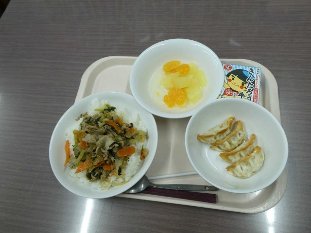 お昼を過ぎても気温は上昇せず、急激に秋が接近してきたようです。窓からは曇り空に水平線が浮かんで見えます。「小松菜豚肉丼、焼き餃子、ミックスフルーツ」の給食を美味しくいただき、午後に備えます。