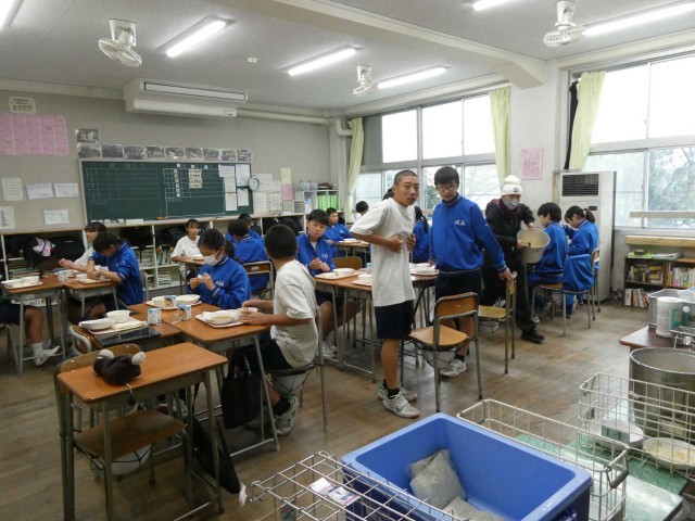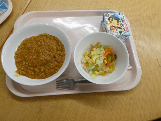 2年生、1年生の給食準備風景です。本日の献立は「ソフト麺カレーソース、温野菜たまねぎドレッシング」です。雨音を背景においしくいただきました。