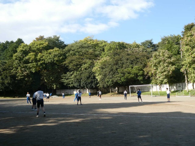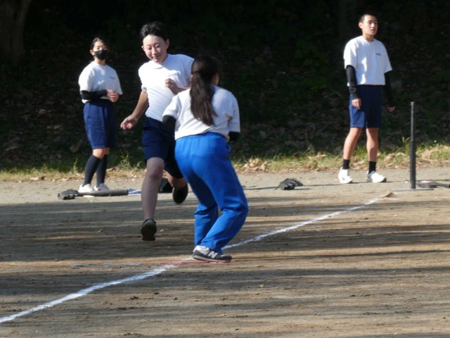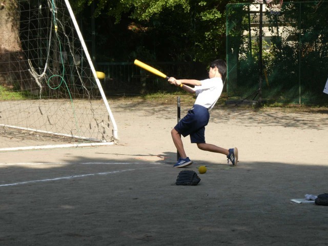 秋晴れの下でTボールに取り組んでいます。「打ってもいいですか」と必ず相手チームの準備を確認してからバットを振ります。お互いに声を掛け合いながらチームワークを学んでいます。