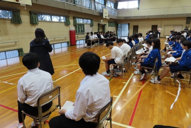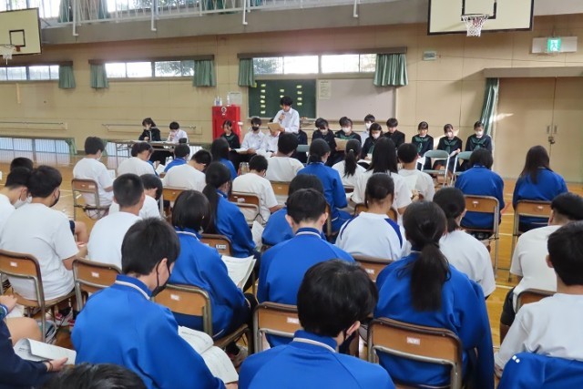 2年生を中心とした後期生徒会役員が活動計画を提案すると同時に、学校生活上の諸問題を話し合って解決することを通して合意形成の手順を学んでいます。また、専門委員会の自主的な活動を展開するために日常生活の向上をめざす確認もしています。