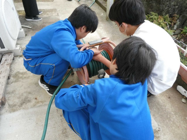 ふれあいファームでは4,5組がカブの栽培に取り組んでいます。水をあげホースを巻くまでが作業になります。ホースをきれいに巻くことはかなり難しいのですが、チームワークで見事に巻き上げました。