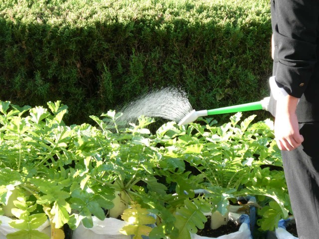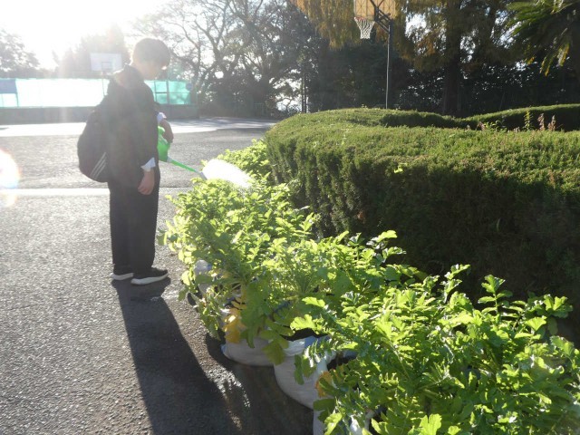 朝早くに登校し、じょうろを使い一つひとつの鉢に丁寧に水をあげる生徒の姿があります。自分の役割を誠実に果たす姿に大人が学ぶものがあります。生徒から水をもらうダイコンたちは嬉しそうな表情をしていました。