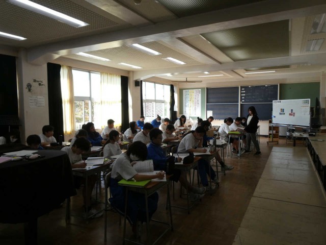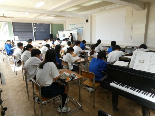 合唱曲「夢の世界を」が流れ、生徒たちはそこから大切なポイントを読み取っているようです。この曲には「落ち葉を踏んで歩いたね…」というフレーズがあり、今の季節に合う曲だと思いました。微笑み交わして語り合えば「夢の世界」が広がることは間違いなさそうです。