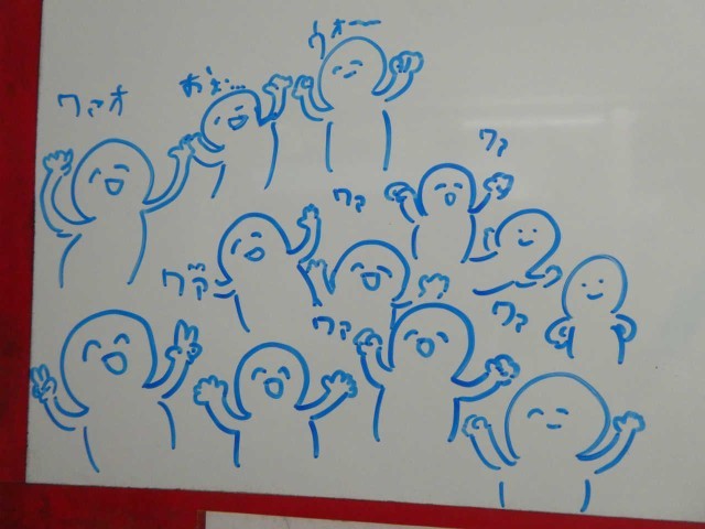 1階廊下のホワイトボードに少し前に描かれた「人々」。生徒たちに優しいエールを送っているようです。みんな仲間!安心してがんばりましょう!