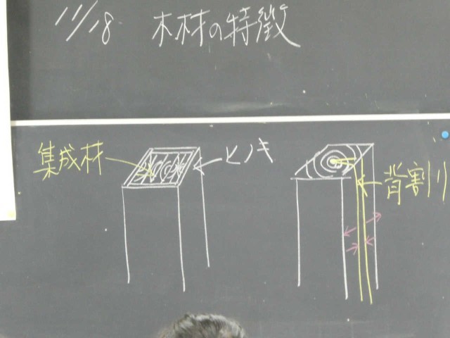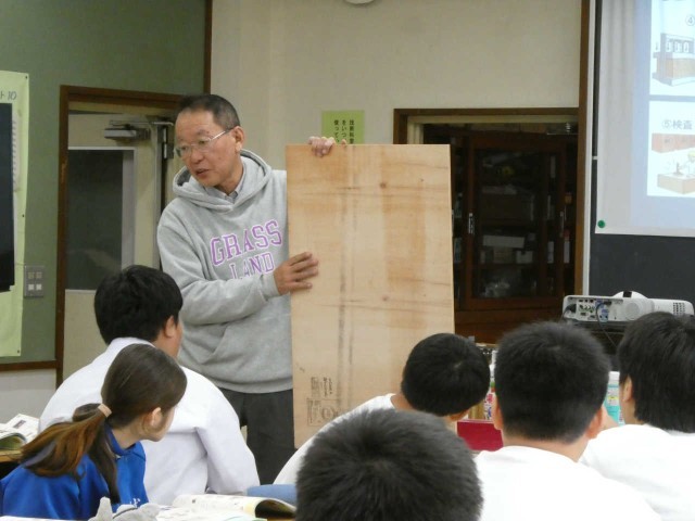 「木材の特徴」がテーマです。「比重」という言葉は「水」が基準となっていることを知ります。ほとんどの木材は水より比重が軽く水に浮きます。しかし、木材は鉄やコンクリートより強度が高く、国立競技場や万博でも広く活用されました。授業の中に専門性と物語性があり、知識が生活の中で駆動する楽しさを感じます。