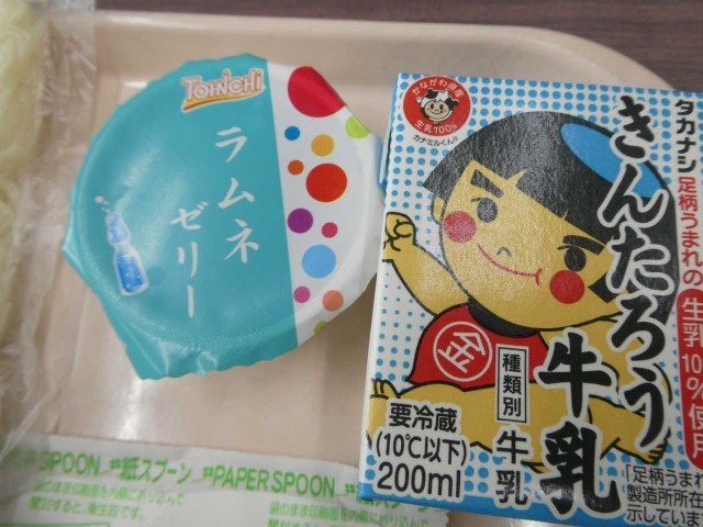 本日の献立は「五目うどん、しゅうまい、ラムネゼリー」です。ラムネゼリーのパッケージの水色に惹かれました。毎日、とてもおいしく給食をいただけることに感謝します。