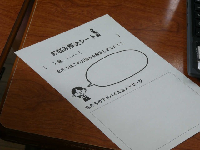 あなたのお悩み解決します。ということで「お悩み解決シート」の制作を班の仲間と和気あいあいと進めています。それにしても人生に悩みは尽きないものです。