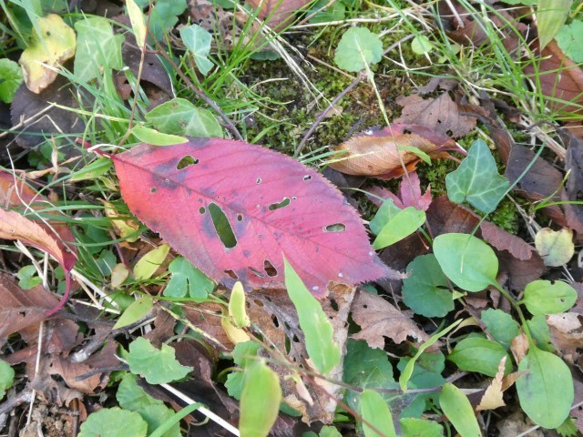 体育館横の城南の森に落葉が重なっています。その中の一枚に、そろそろ土に帰ろうとしている赤紫色の穴の空いた葉が目に留まりました。緑の葉たちが優しく見守っているように映りました。人間社会もこうありたいものです…。