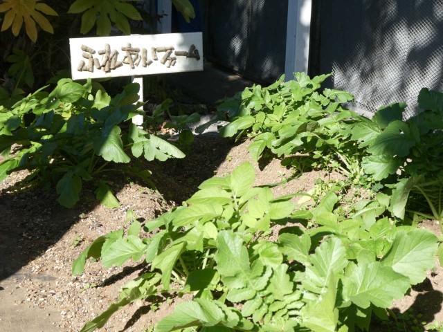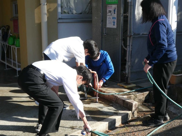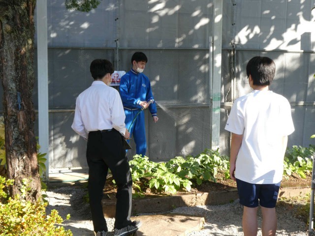 ふれあいファームでは、4,5組がダイコンやカブを栽培しています。特別教室へのエアコン設置工事のためホースを伸ばすにもひと苦労あります。それぞれに役割分担をしてチームワークよく、水やりをしていました。