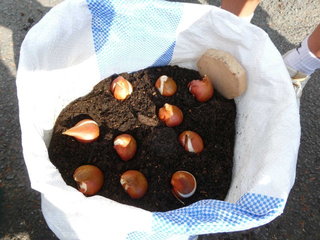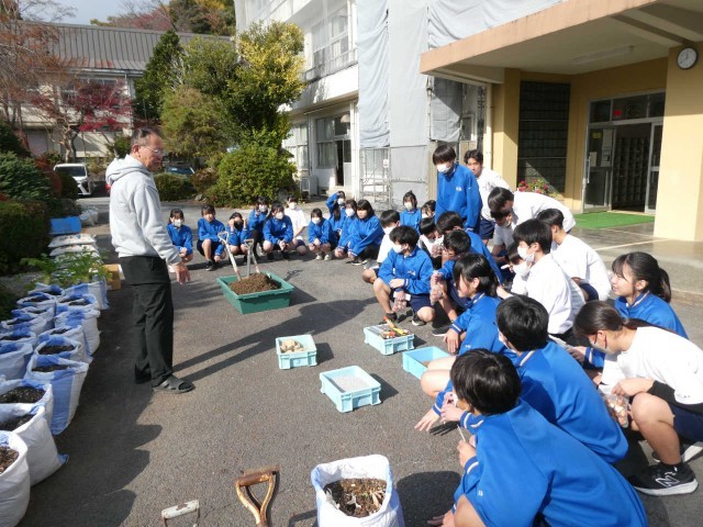 大根の栽培を一手に引き受けていた土嚢鉢、感謝を伝えるのと同時に次の役割がやってきました。本時はチューリップの球根の植え込みです。鉢の古い土を三分の一程新しい土と入れ替え、肥料を混合して球根を10個置きます。指導教諭の段取り説明のように生徒たちは熱心に活動し、時間内に作業が完了しました。