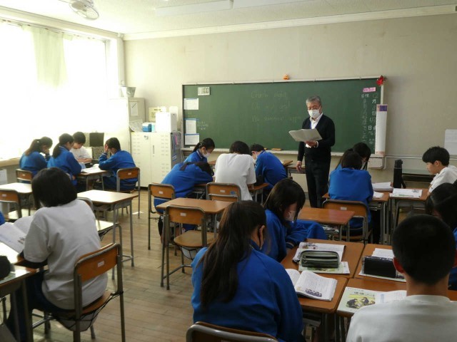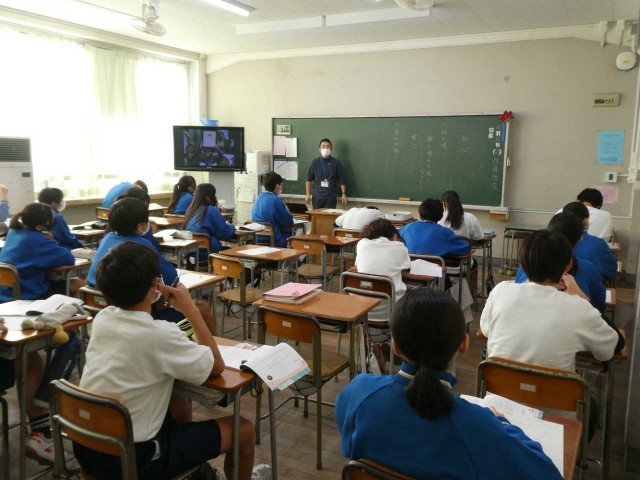2年生の教室では教頭先生が道徳の授業を行っていました。答えがひとつに決まらない道徳には、授業を展開する難しさがあります。生徒たちと協力して、一緒に授業を作っていく優しい空気が教室に流れていました。