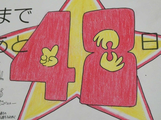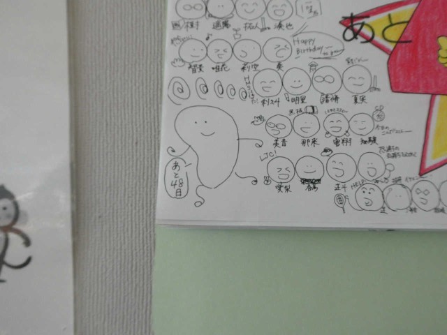 放課後1,2年生は担任の先生と二者面談中です。3階まで進むと、少し気が早いのですが、3年生教室の明日のカレンダーにグッと引き寄せられました。楽し気なクラスの雰囲気が一枚の紙に詰まっている作品です。カウント48!