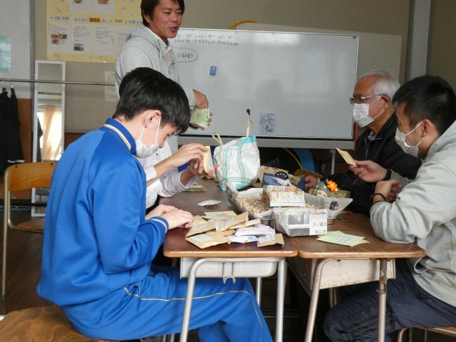 明日の「たわし販売」に向けて、準備が着々と進んでいます。たわしを購入していただくと、敷地内で収穫されたぎんなんがもれなく付いてきます。お店で買うと、かなり高価になります。写真はぎんなんを袋詰めしているところです。