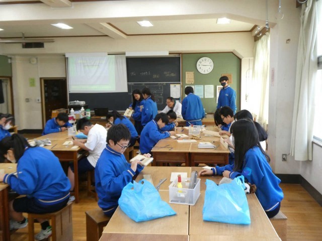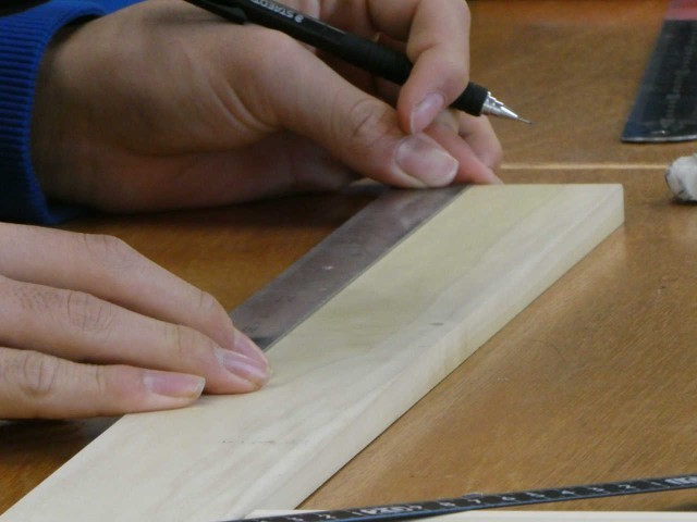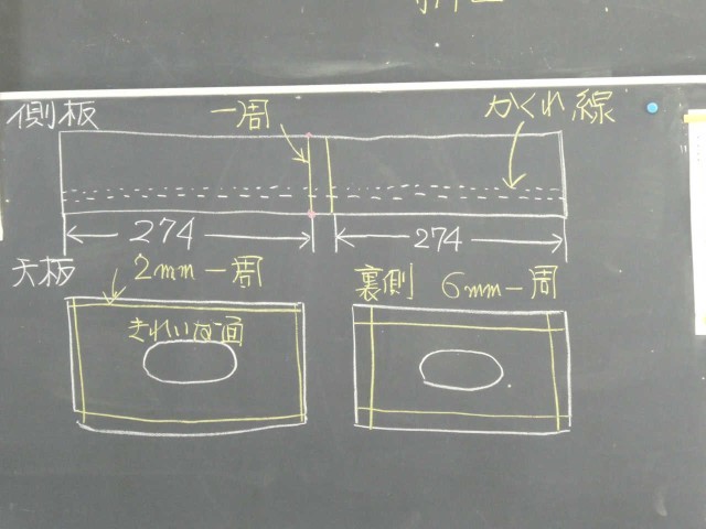 けがき1「直角定規を活用しよう」が本時のテーマです。木製ティシュBOXの制作が本格的にはじまりました。黒板の図を見ると「けがき」の様子がよく分かります。授業がユニバーサルデザイン化されていて、生徒の目の輝きが生き生きとしています。