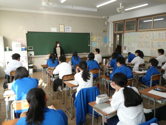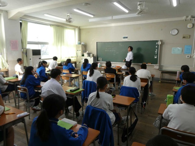 キャリア教育のはじまりでしょうか。先生が自分の人生経験を生徒たちに語ります。身近な人の人生を知ることが、一番の学びになることでしょう。生徒たちは先生の人生に興味津々の様子でした。