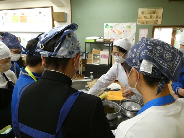 おせち料理の実習がはじまりました。授業2時間の中で、紅白なます、昆布巻き、伊達巻、栗金団、田作り、の五品を作ります。指導教諭が制作した伝統のレシピを片手に生徒たちが頑張ります。