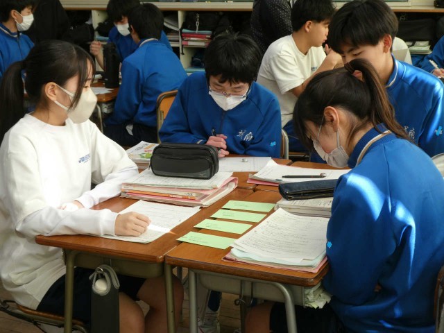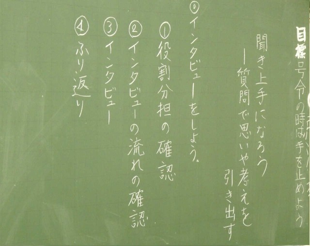 「聞き上手になろう」をテーマに研究授業が公開されています。きれいな文字の板書から本時の内容が明確に示され、授業がユニバーサルデザイン化されています。班ごとの話し合いもおだやかに丁寧に進み、授業作りがクラス作りに結びつく授業形態です。