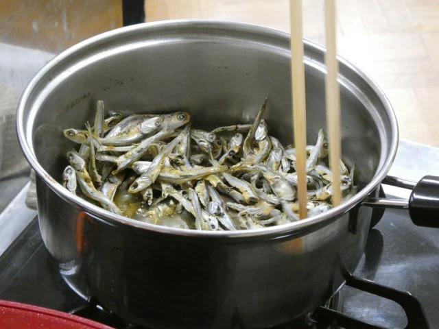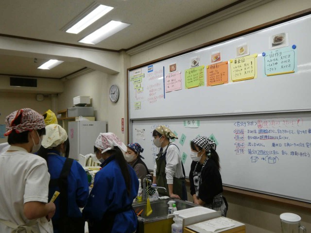午後は1組が「おせち料理」に挑戦です。スクボラ、スクールサポートスタッフの方々の応援態勢も万全です。指導教諭の声が調理室に凛として響きます。手の込んだ五品を時間内で作るには段取りが大切になります。