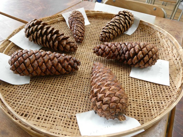 教室では、とても大きな松ぼっくりを乾燥中です。先週消毒のために鍋の中で煮沸されたものです。この松ぼっくりでアートが生まれるのでしょうか。
