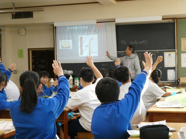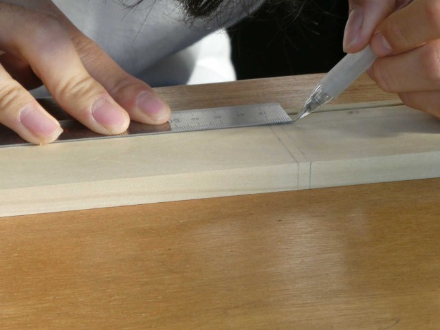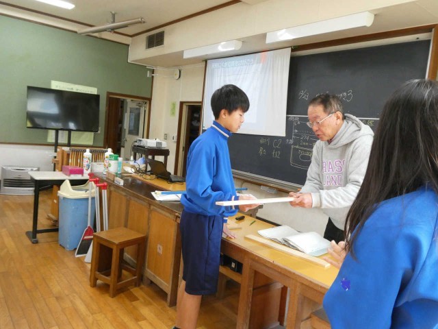 授業の後半は木材への「けがき」です。明確な指示の後、生徒たちの集中力がアップします。生徒一人ひとりの作業工程を教諭はつぶさに確認し、アドバイスをおくります。「対話的で深い学び」の源が随所に散りばめられています。