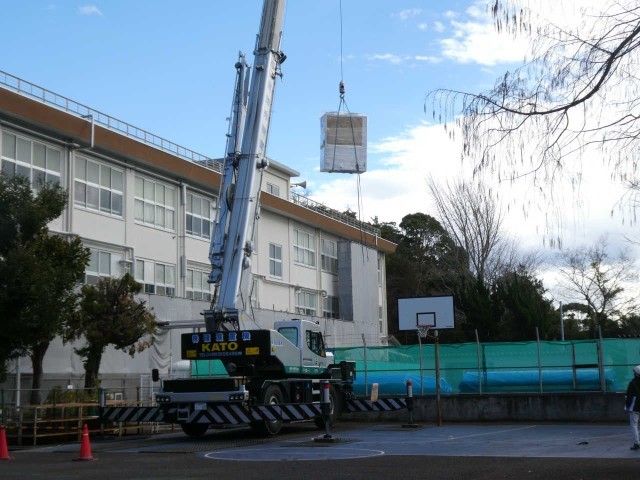 エアコンの室外機がクレーンにより持ち上げられ、宙を舞います。仕事は確実に一歩一歩進んでいきます。来年の夏は特別教室でも快適に授業を受けることができます。
