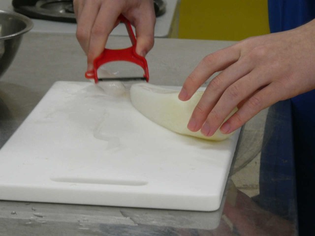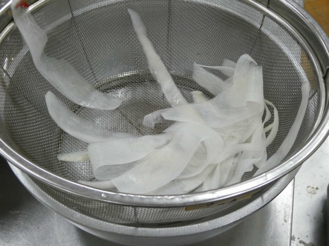 作業を繰り返すことで生徒はピーラーを使うコツを習得していきます。だんだん職人さんのような動きになり、薄切りのスピードもアップしていきます。とれたてのダイコンは輝いて映り、とてもおいしそうです。
