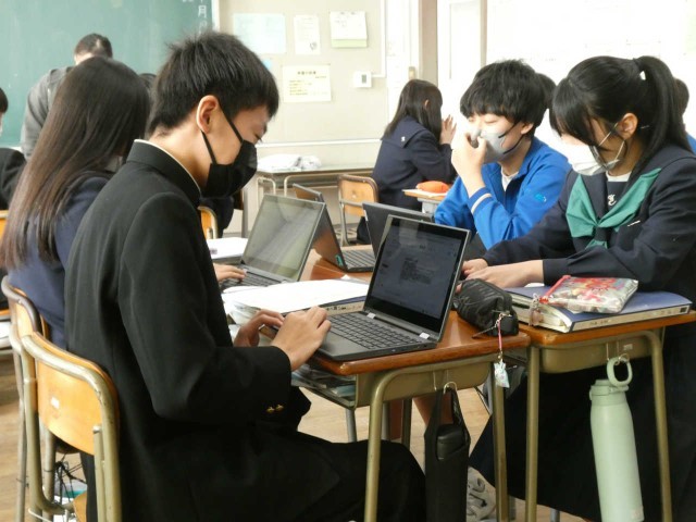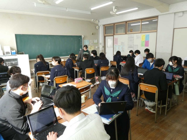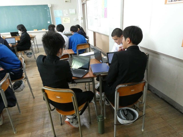 3年生は中学校の教室で、今の学習用端末に触れる時間も少なくなってきました。各自がテーマを設定し、レポートを作成中です。班で仲良く思考を深めることができるのも、学習用端末のおかげかもしれません。