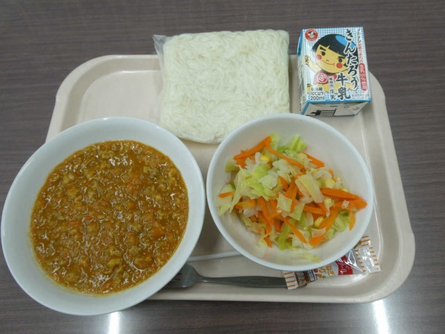 本日の献立は「ソフト麺、カレーソース、温野菜、玉ねぎドレッシング」です。野菜は人の手で刻まれた感じがします。ドレッシングをかけていただくと意外な美味しさが広がりました。給食を準備してくださる方々の温もりが伝わってきました。